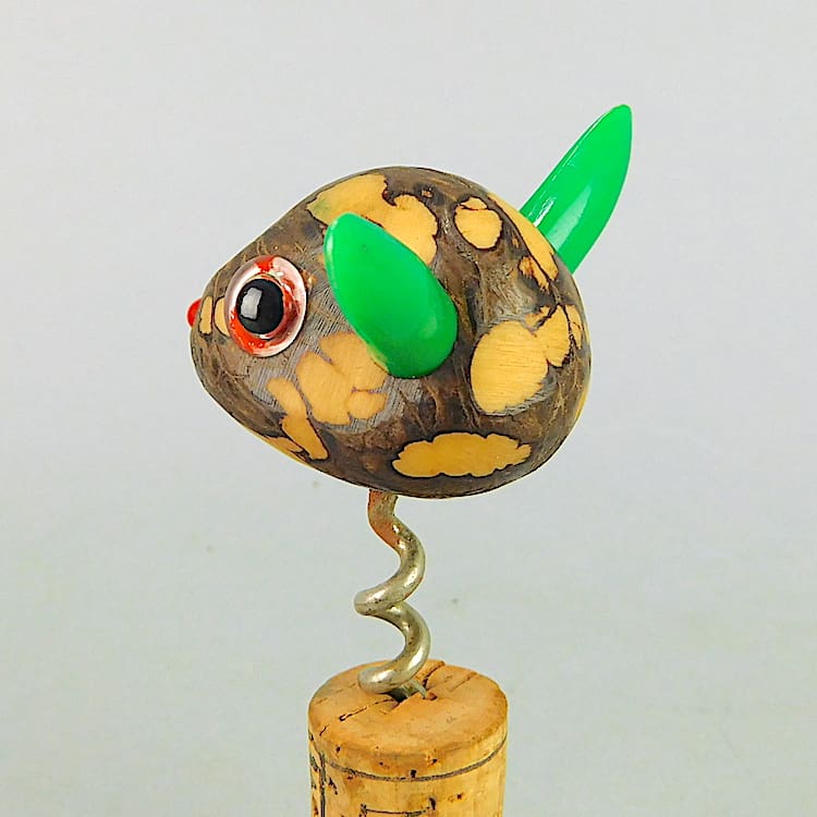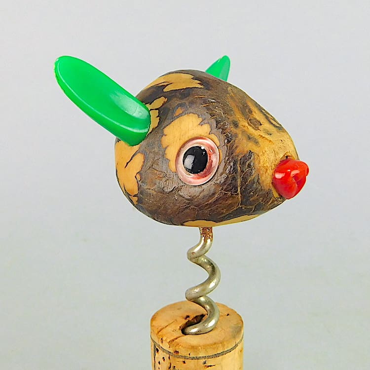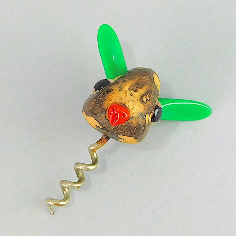 Unusual bottle opener, instead of the usual nutbird theme this ones a nut rabbit. It has phenolic ears and nose and glass eyes.