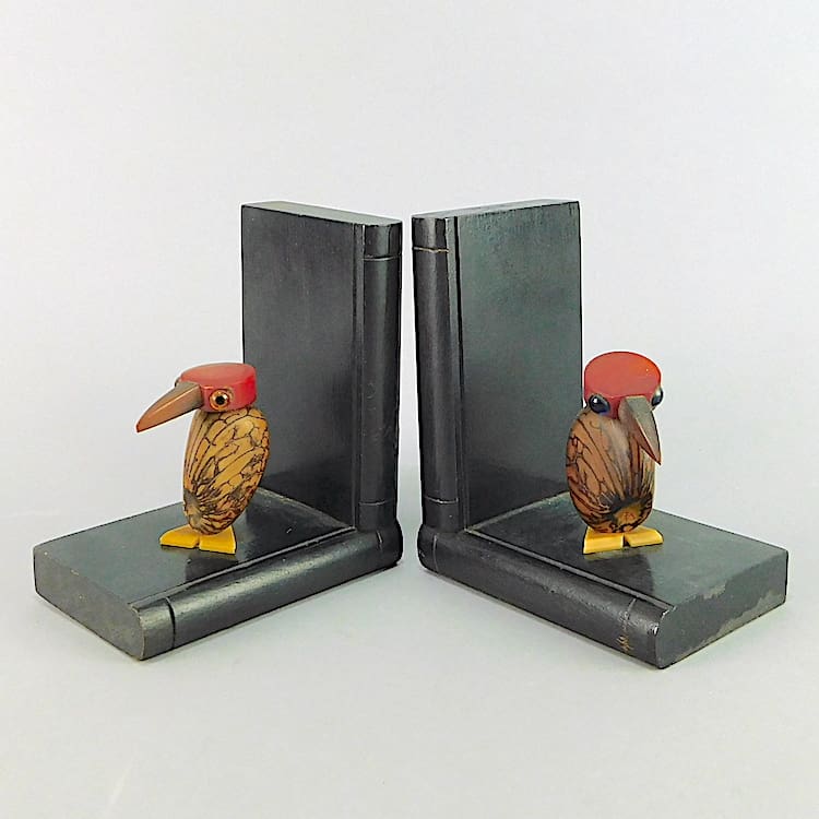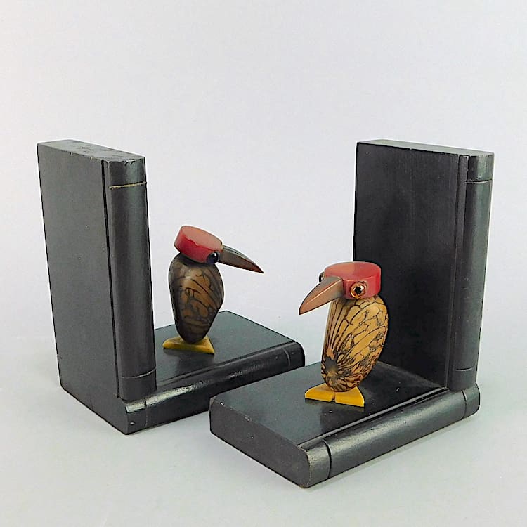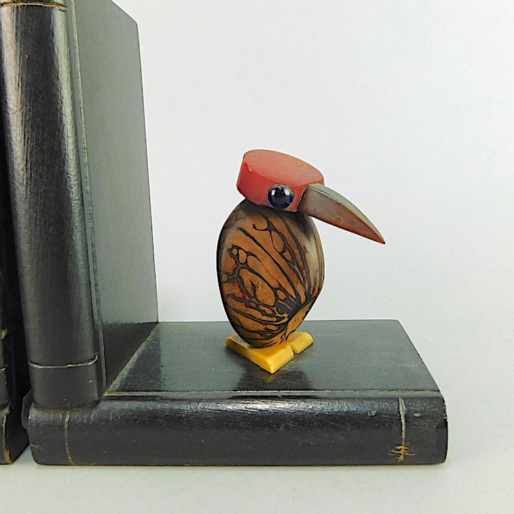 Nutbird bookends with phenolic beaks and feet and glass eyes. Each is mounted on an ebonised wooden book base.