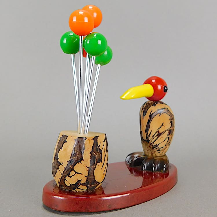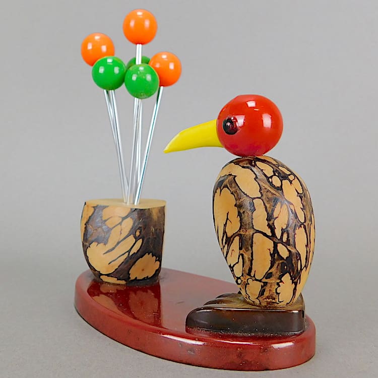 French Art Deco nut bird with a phenolic head and beak and a nut body and sticks holder.