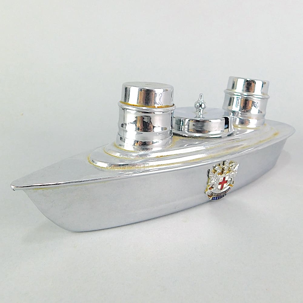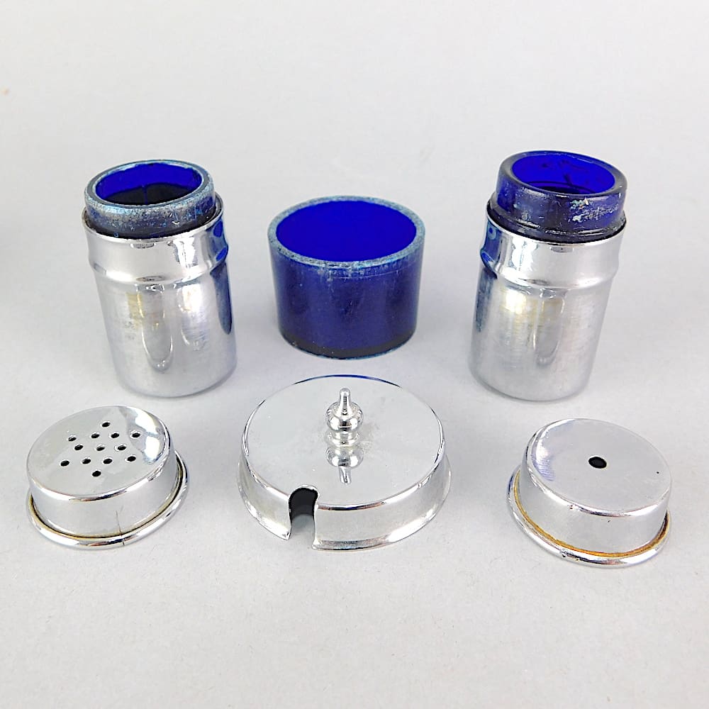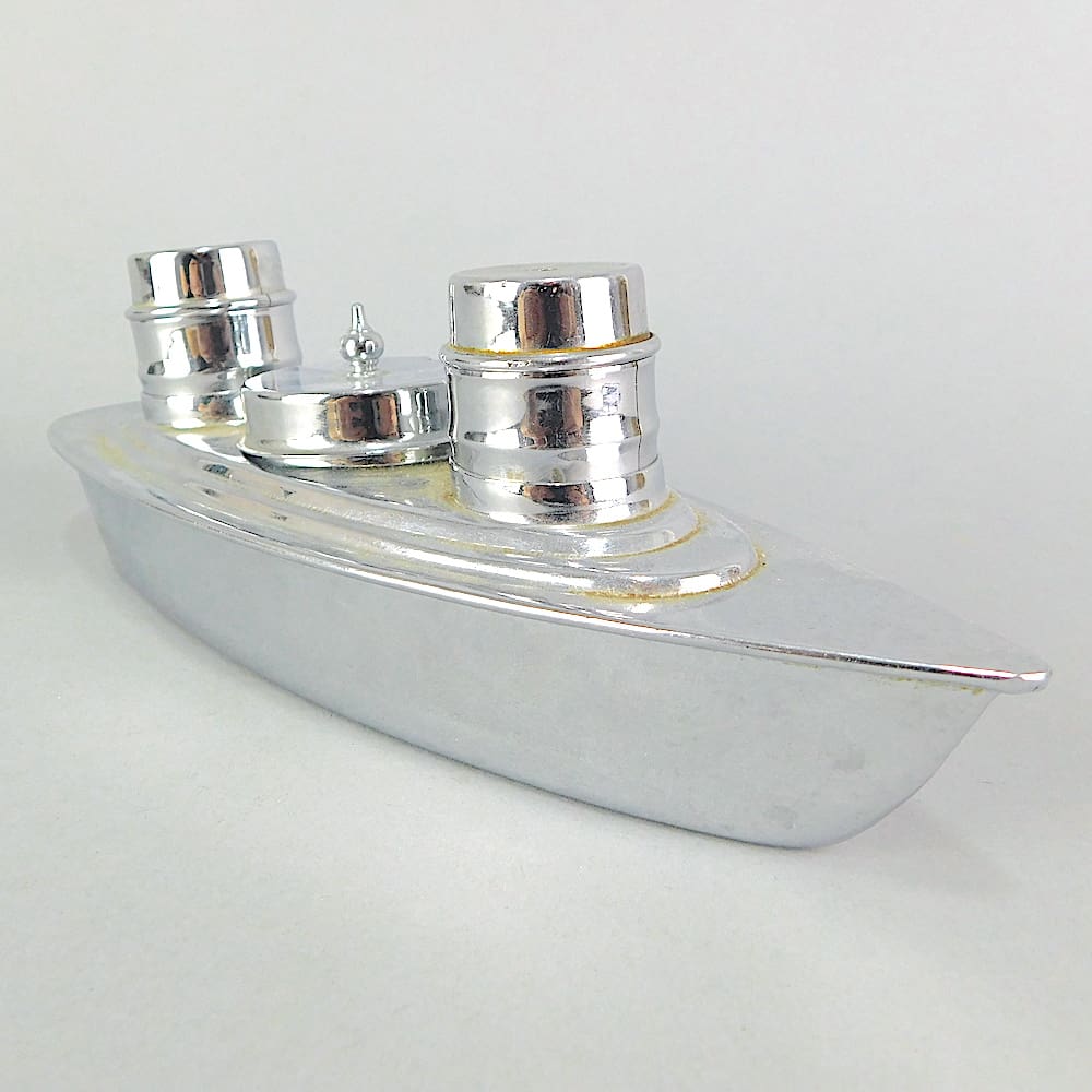 English chromed metal ship with salt and pepper pot funnels and central lidded mustard pot, each lined in blue glass.