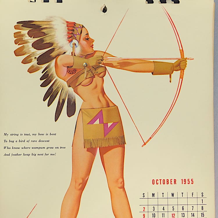 Part of an original Esquire Calendar for the year 1955 illustrated by the celebrated artist George Petty. Although the entire calendar is present, only 9 pages are in good condition. January, November and December are damaged. This is OCTOBER 1955 and it is in good vintage condition. These will be sold unframed as posting with glass is uninsurable in the post and risk being damaged. Your local framing shop will be able to frame these for you cheaply and with your own choice of frame. These original vintage calendars are no very difficult to find, even in the USA where they originated.