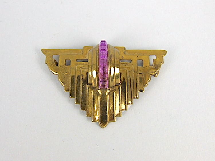 Gilt metal brooch with purple phenolic panel detail. It is fitted with a roll safely clasp.