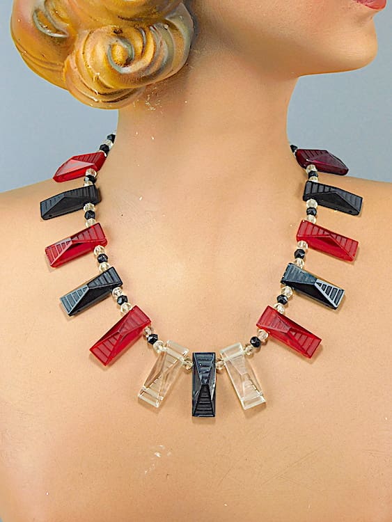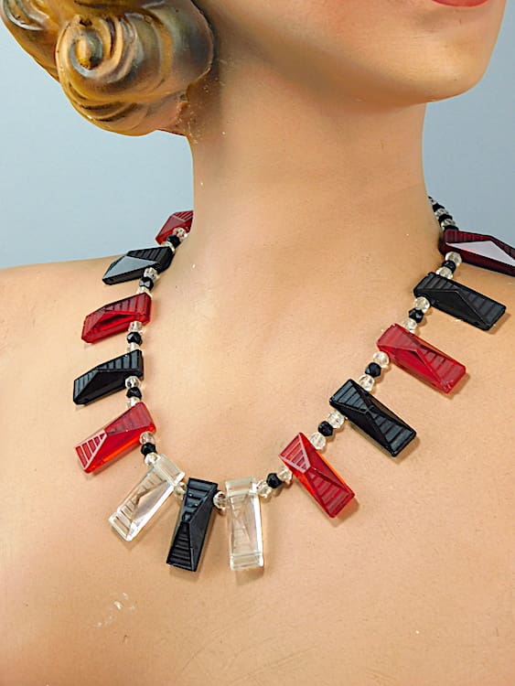 Wonderful chunky glass black red and clear glass fringe necklace.