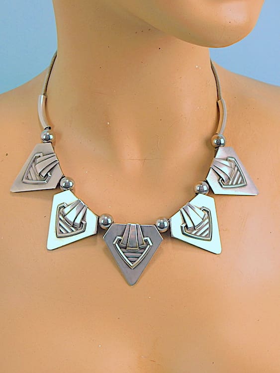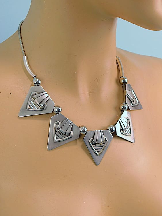 Chunky silvered metal necklace. Each panel measures 1.5 inches square (4cm) and there are 5 of them – so quite a chunky necklace.