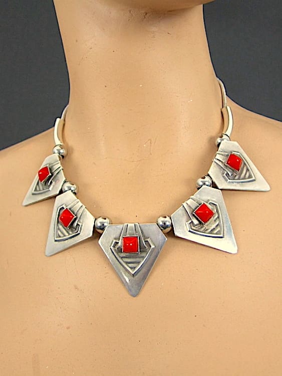 Chunky silvered metal and red onyx stone necklace. Each panel measures 1.5 inches square (4cm) and there are 5 of them – so quite a chunky necklace.