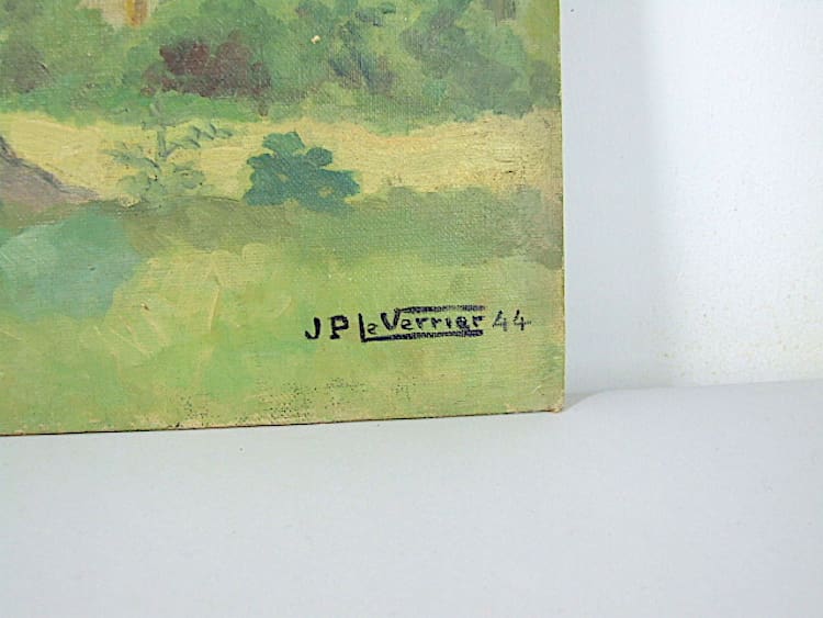 An original oil on board from the archives of the Le Verrier family. Signed J P Le Verrier – the son of Max Le Verrier and dated 1944. To the back of the board is a hand drawing of a horse by JP LV. Unframed.