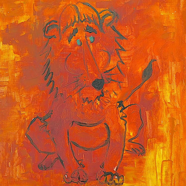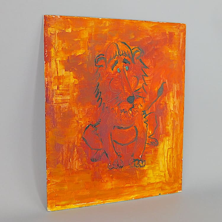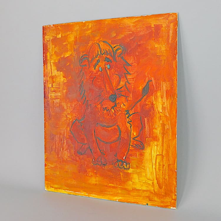 Original 1940s oil on board painting from the archives of the Le Verrier family. An abstract Lion in vivid orange and black. Unsigned but by J P Le Verrier – the son of Max Le Verrier. Unframed.