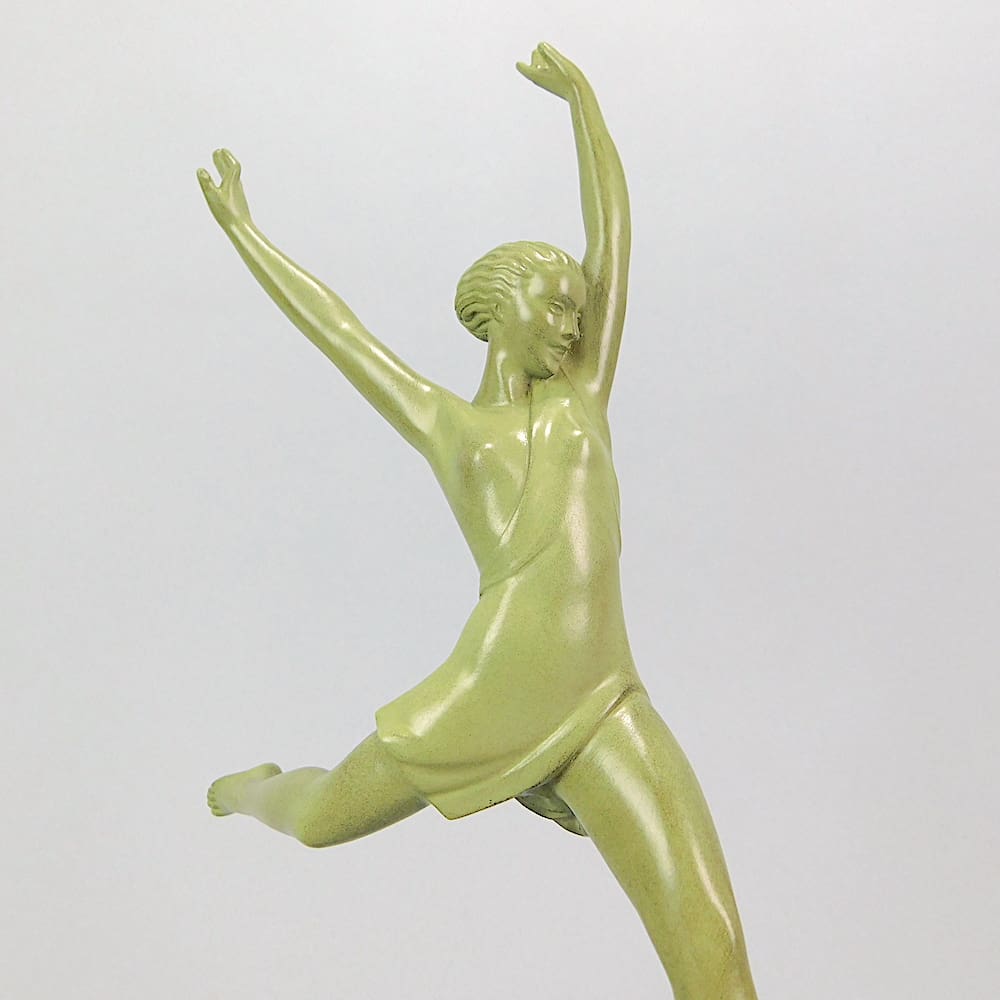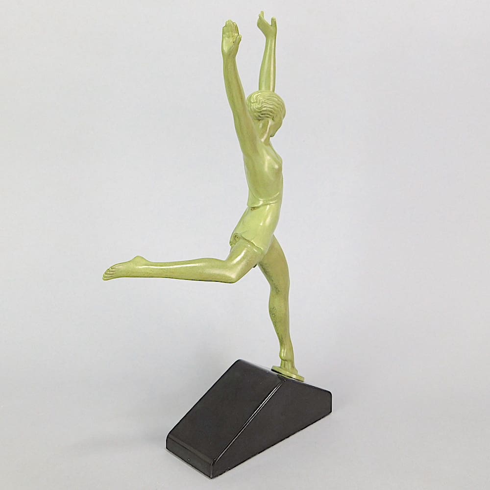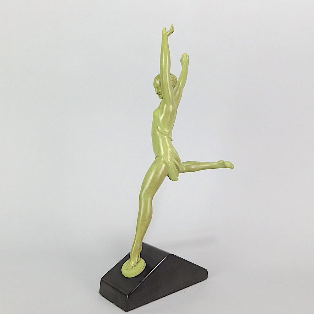 This is the smaller model of Olympie by Pierre Le Faguays (signed in his pseudonym Fayral). Signed to the back of her leg and bearing the Le Verrier foundry stamp. I also have the larger version of this art deco statue which measures 19.5 inches high (50cm) which can be viewed in the large spelter figures section.