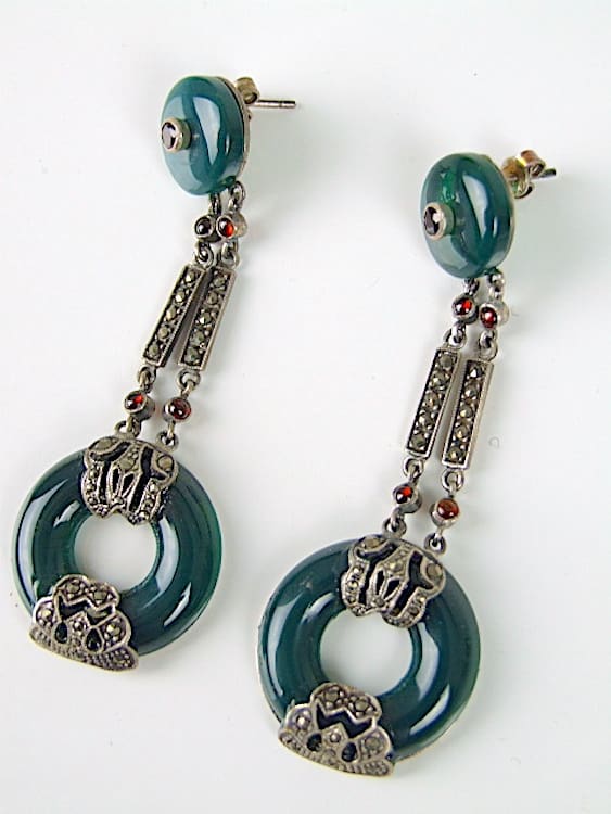 Green onyx and silver earrings with diamonte and rhinestone detail. They are made for pierced ears.