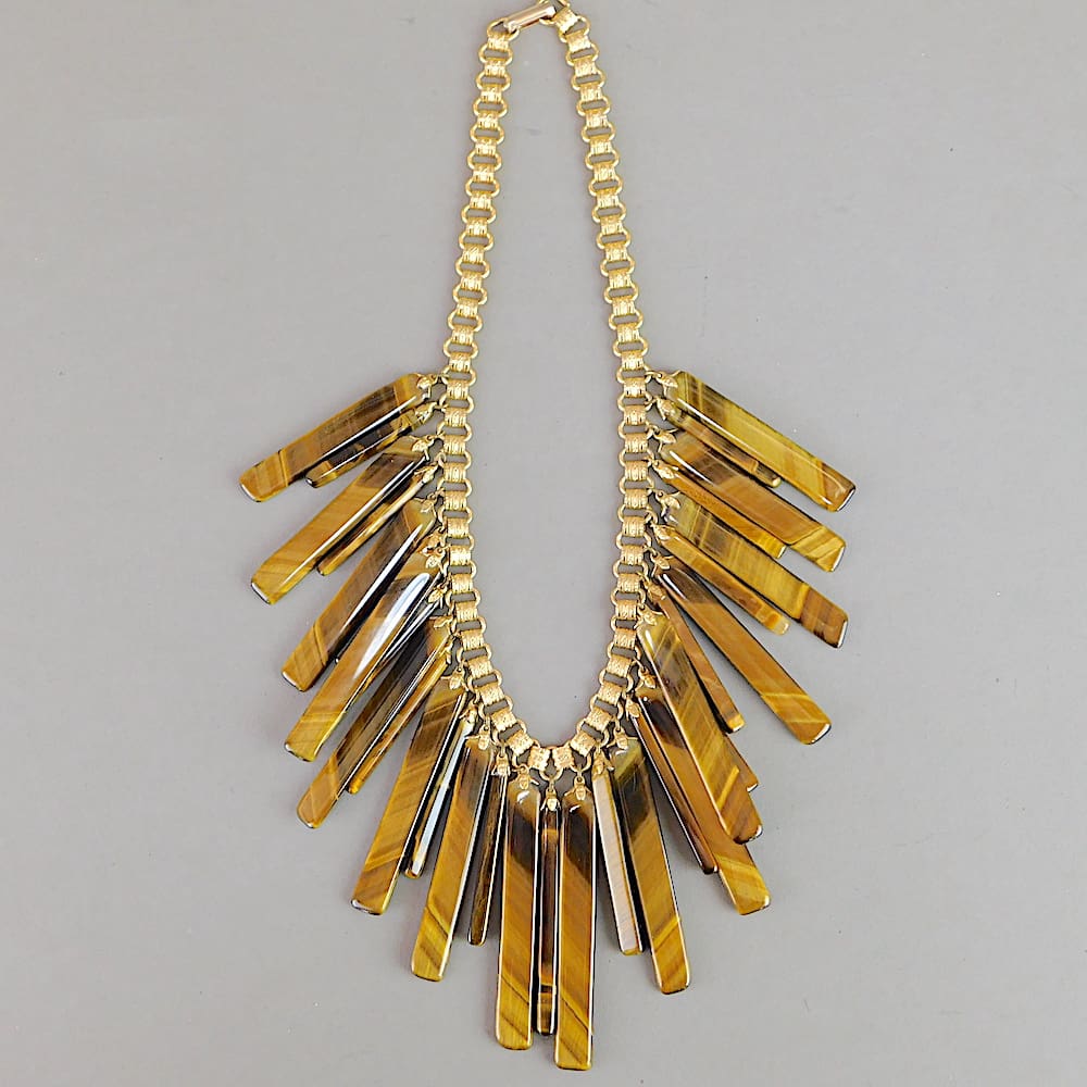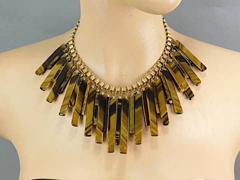 Heavy brown pearlised onyx (which I believe may be tigers eye) and gilt metal art deco fringe necklace.