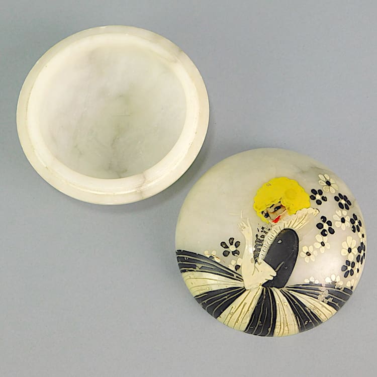 Pretty hand painted French art deco powder bowl made of cream onyx with a lovely masked lady painted on the lid.