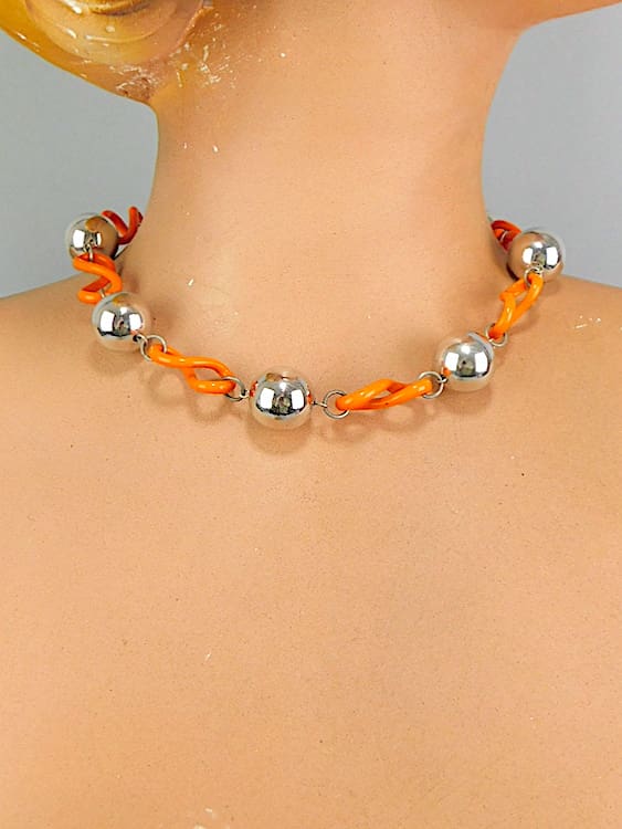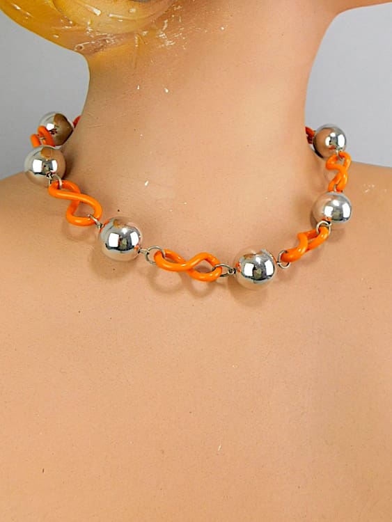 Chunky chrome balls with bright orange twisted loops of galalith.