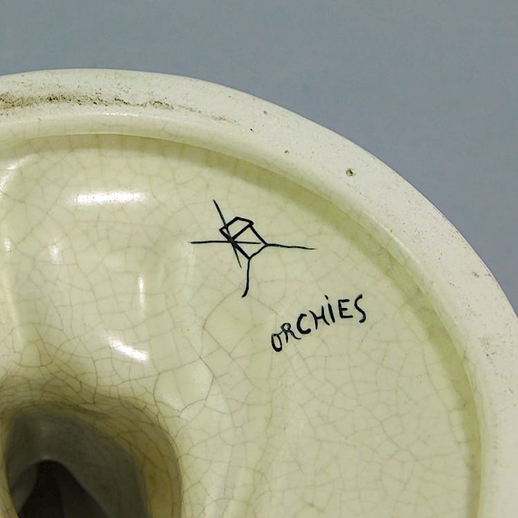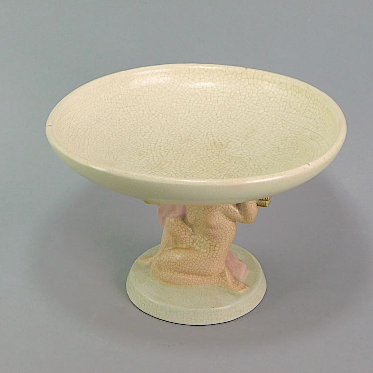 Fabulous French crackle glaze tazza (fruit bowl) with a stylised lady holding the bowl up. Signed under the base Orchies with the windmill mark and stamped made in France.