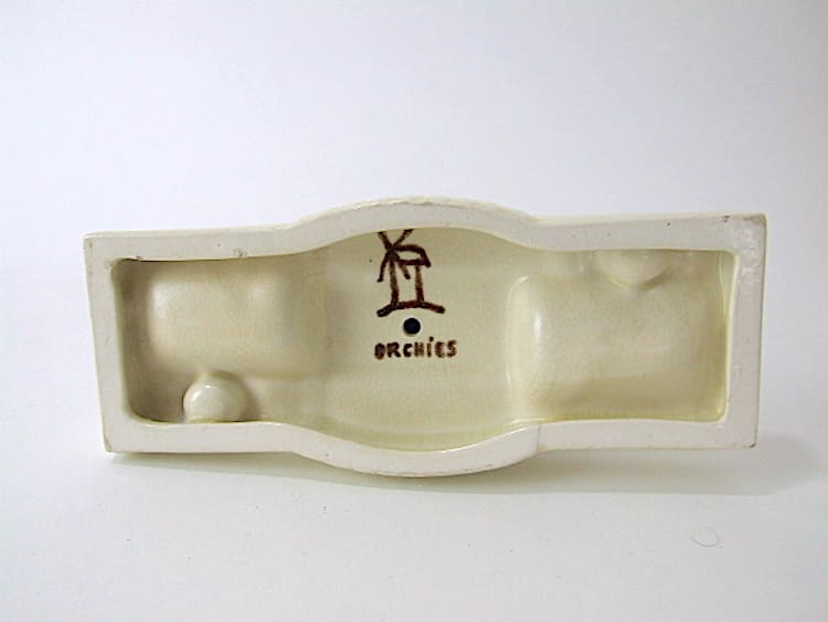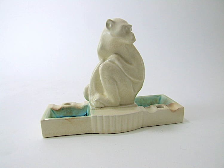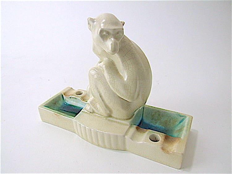 French art deco ceramic crackle glaze monkey ashtray, a signed piece by the Orchies company. A cream crackle glaze with blue and brown wash ashtray sections to either end.