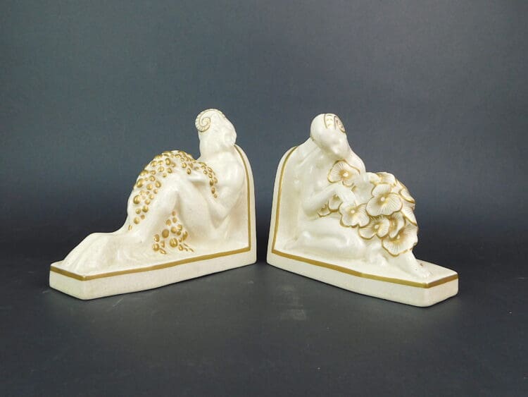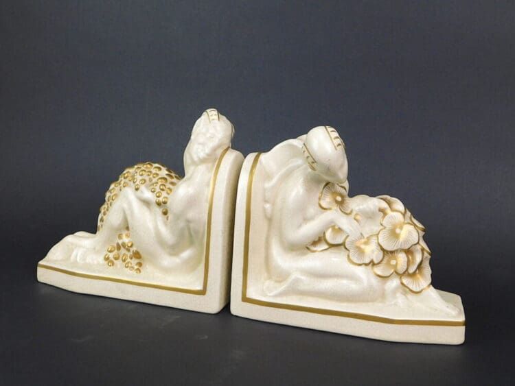 French art deco ceramic craquelier bookends in cream and gold glaze. They are marked Orchies and bear the windmill logo under the base.
