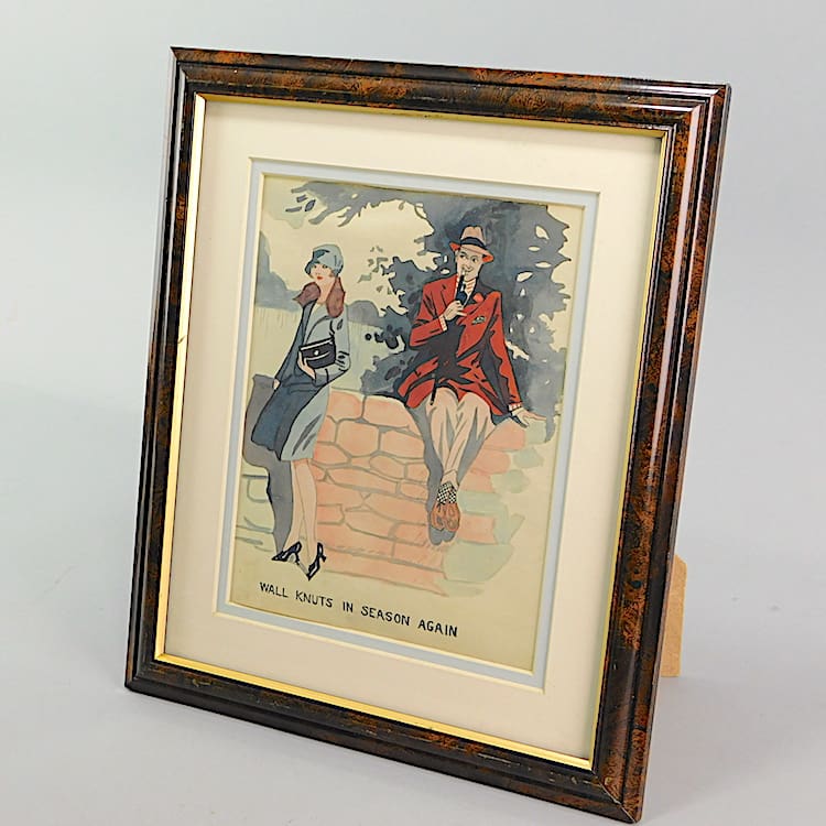 Original 1920s water colour by W. Edwards, amusing and very flapper themed. This picture is entitled Wall Knuts in Season Again, and is unsigned. Framed in a contemporary wood frame with walnut effect finish.
