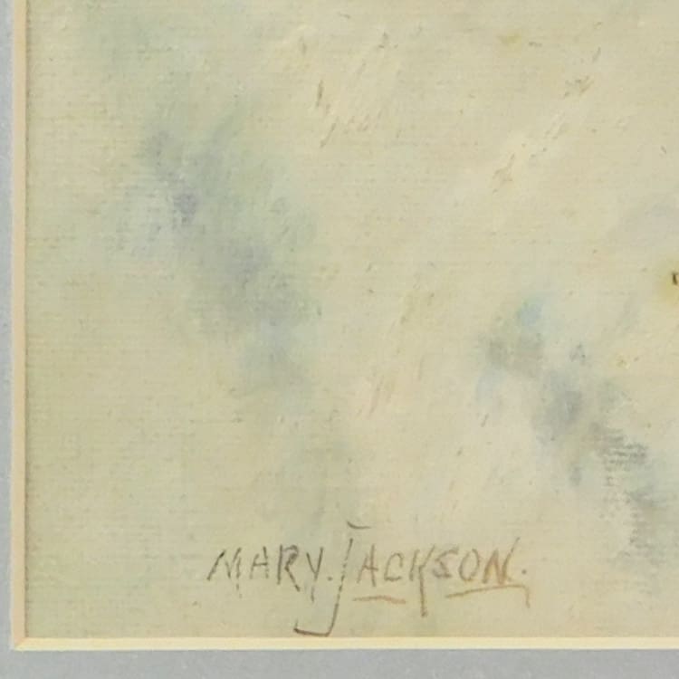 A pretty painting on board signed by the artist Mary Jackson and framed in a contemporary silver wood frame.
