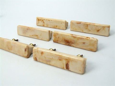 English phenolic art deco handles for use on cabinets and drawers. These handles have never been used and are an old vintage unsold shop stock item.