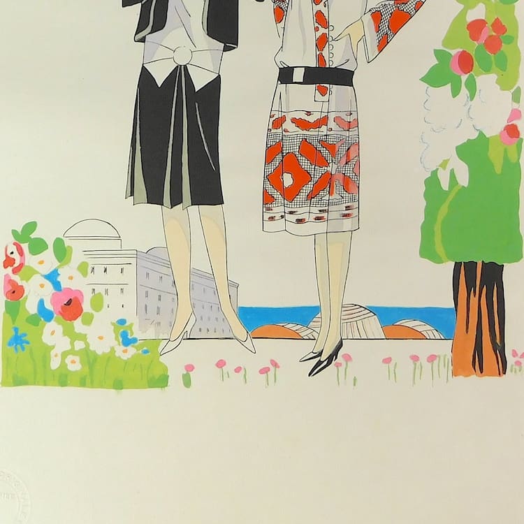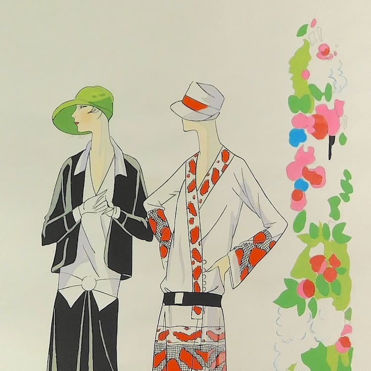 French art deco gouache fashion painting. Beautifully hand painted (this is not a print) and stamped with an impressed mark that reads – Gouache Originale Peren Art. Item is sold unframed.