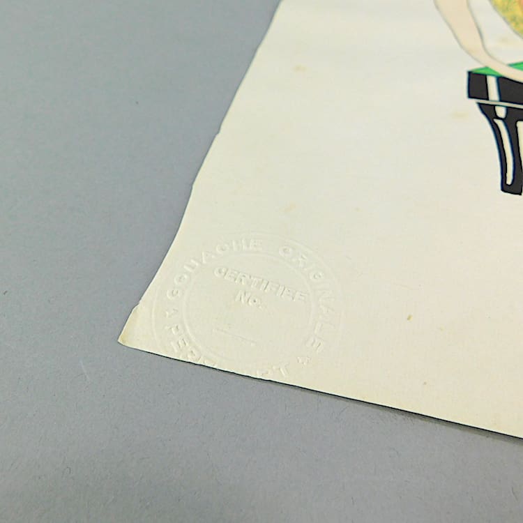 French art deco gouache fashion painting. Beautifully hand painted (this is not a print) and stamped with an impressed mark that reads – Gouache Originale Peren Art. Item is sold unframed.