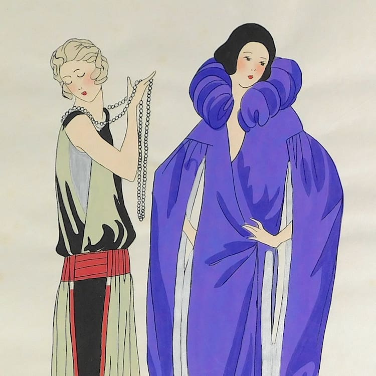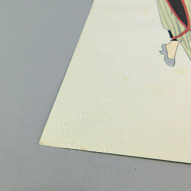 French art deco gouache fashion painting. Beautifully hand painted (this is not a print) and stamped with an impressed mark that reads – Gouache Originale Peren Art. Item is sold unframed.
