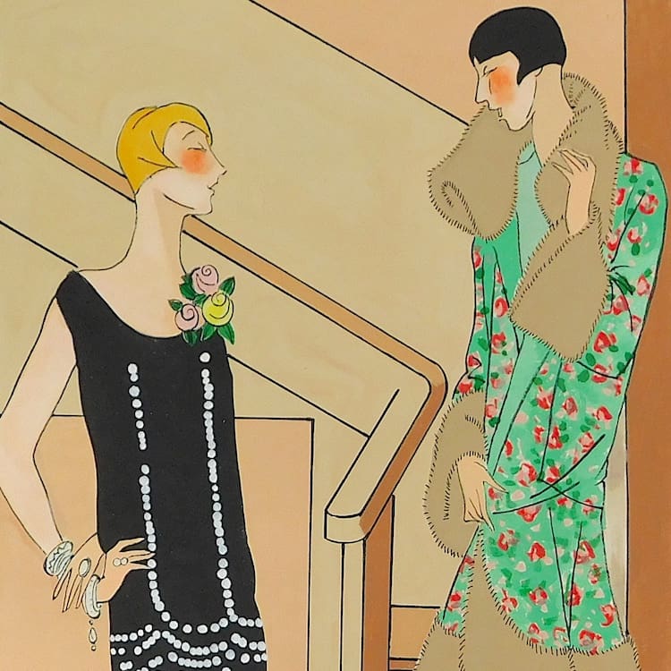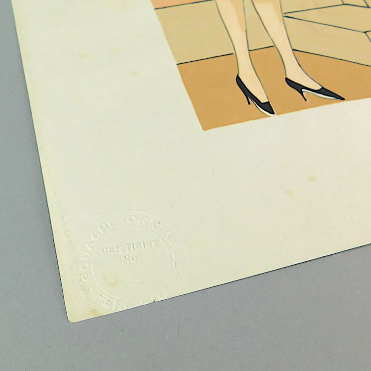 French art deco gouache fashion painting. Beautifully hand painted (this is not a print) and stamped with an impressed mark that reads – Gouache Originale Peren Art. Item is sold unframed.