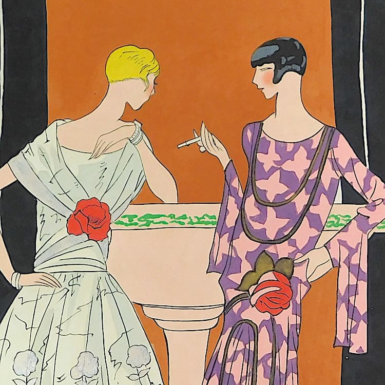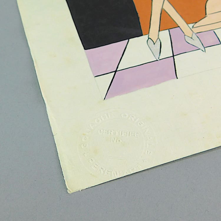 French art deco gouache fashion painting. Beautifully hand painted (this is not a print) and stamped with an impressed mark that reads – Gouache Originale Peren Art. Item is sold unframed.