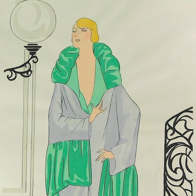 French art deco gouache fashion painting. Beautifully hand painted (this is not a print) and stamped with an impressed mark that reads – Gouache Originale Peren Art. Item is sold unframed.