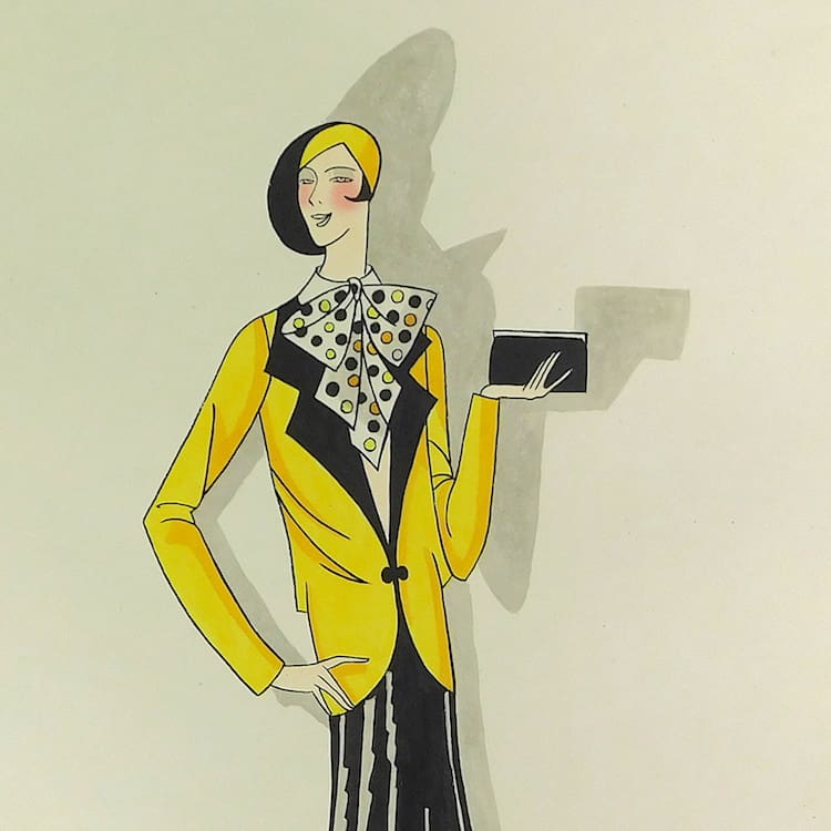 French art deco gouache fashion painting. Beautifully hand painted (this is not a print) and stamped with an impressed mark that reads – Gouache Originale Peren Art. Item is sold unframed.