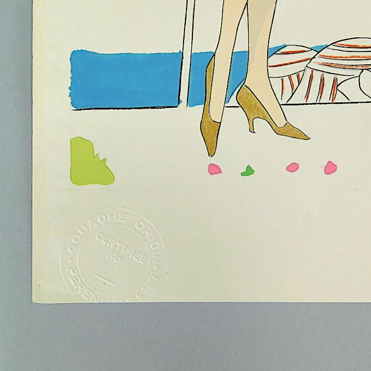 French art deco gouache fashion painting. Beautifully hand painted (this is not a print) and stamped with an impressed mark that reads – Gouache Originale Peren Art. Item is sold unframed.
