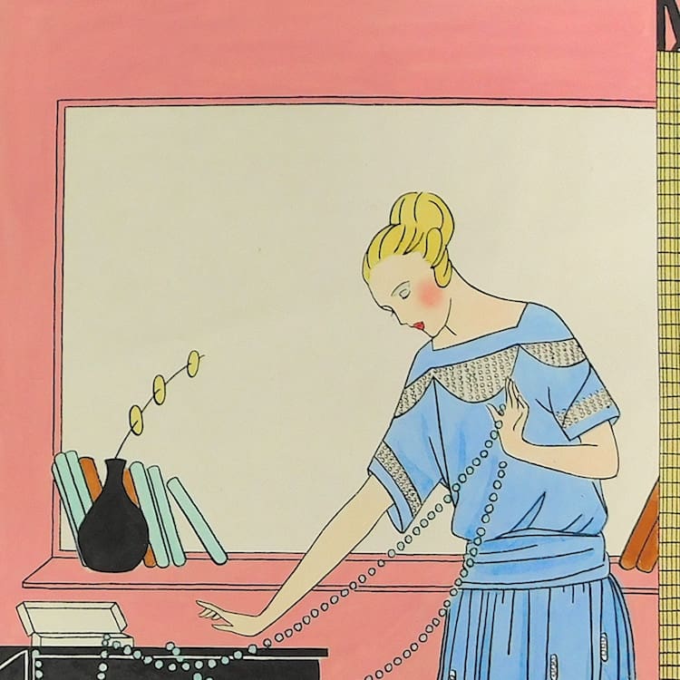 French art deco gouache fashion painting. Beautifully hand painted (this is not a print) and stamped with an impressed mark that reads – Gouache Originale Peren Art. Item is sold unframed.