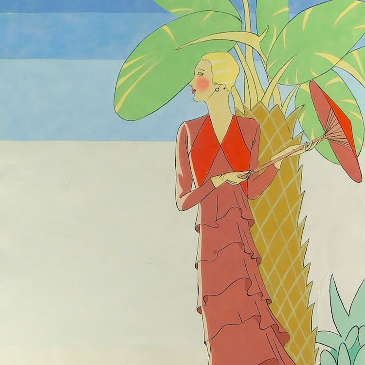 French art deco gouache fashion painting. Beautifully hand painted (this is not a print) and stamped with an impressed mark that reads – Gouache Originale Peren Art. Item is sold unframed.
