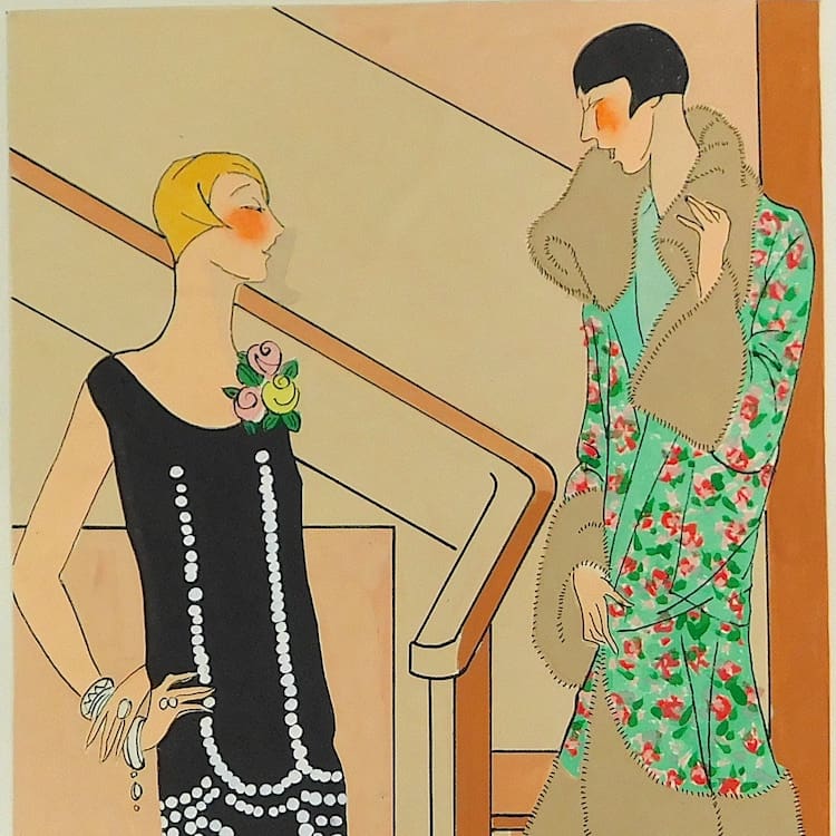 French art deco gouache fashion painting. Beautifully hand painted (this is not a print) and stamped with an impressed mark that reads – Gouache Originale Peren Art. Item is sold unframed.