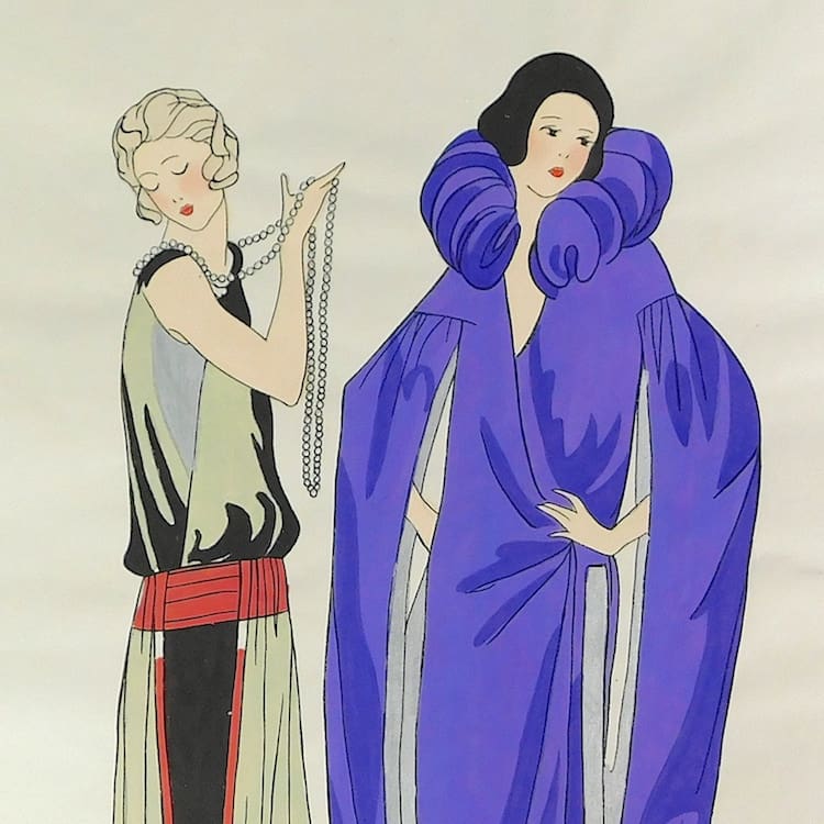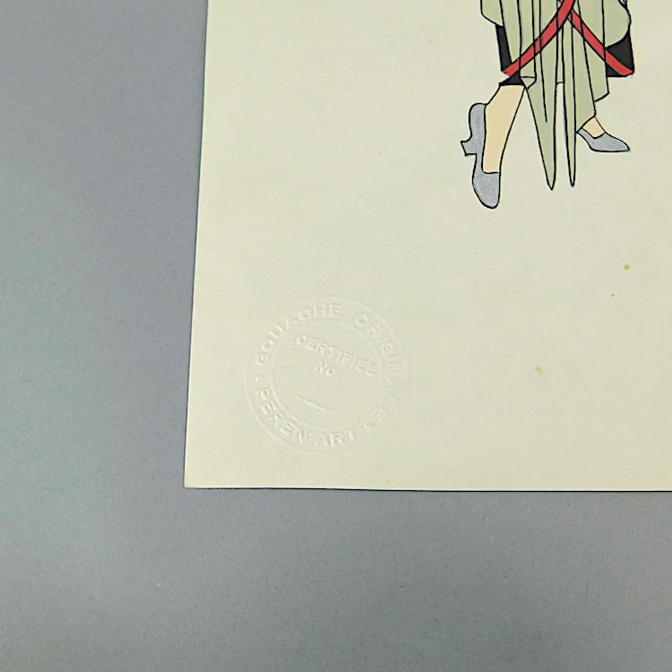 French art deco gouache fashion painting. Beautifully hand painted (this is not a print) and stamped with an impressed mark that reads – Gouache Originale Peren Art. Item is sold unframed.