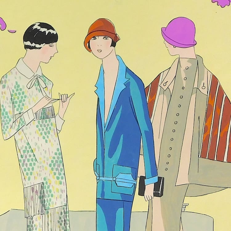 French art deco gouache fashion painting. Beautifully hand painted (this is not a print) and stamped with an impressed mark that reads – Gouache Originale Peren Art. Item is sold unframed.