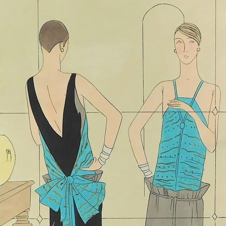 French art deco gouache fashion painting. Beautifully hand painted (this is not a print) and stamped with an impressed mark that reads – Gouache Originale Peren Art. Item is sold unframed.