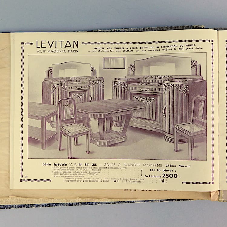 Original French Mueble Levitan (Furniture) catalogue. Dating to the 1920s/30s. Showing all household furniture from modernist bedroom suites, buffets, rugs and chairs. It has 139 pages with drawings and designs. Lots of important information on the inner pages. Amazing it has survived.