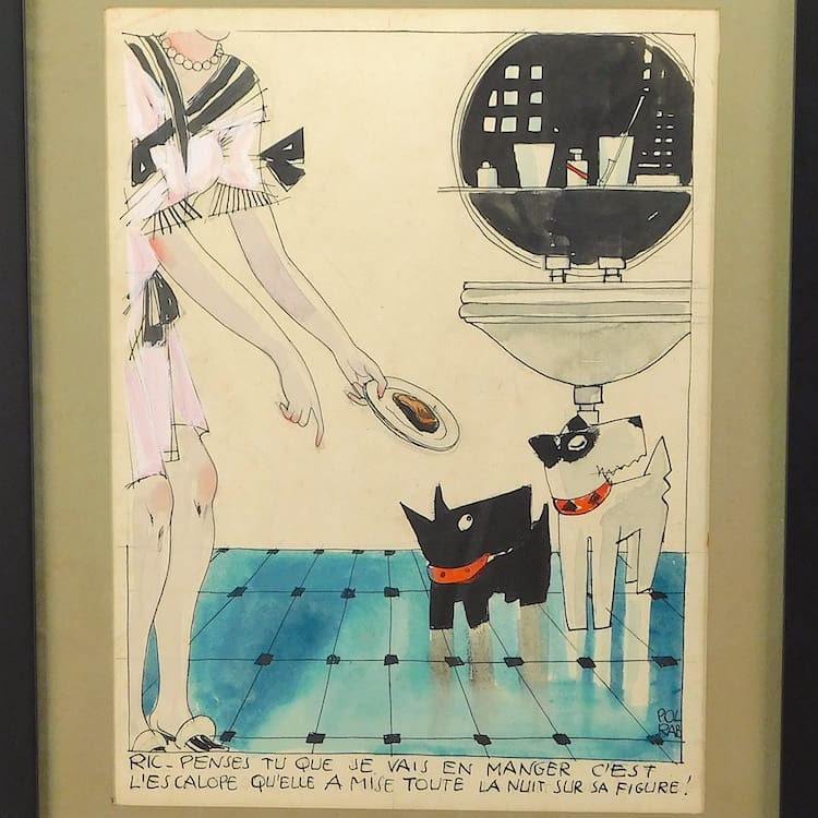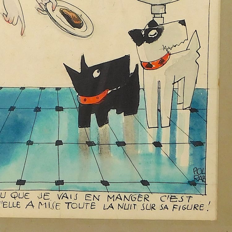 An original water colour by Pol Rab of the famous Ric and Rac terriers. It reads – ric – “penses tu que je vais en manger c’est l’escalope qu’elle a mise toute la nuit sur sa figure!”. Ric says he will not eat a steak she has had on her face all night. Framed in a contemporary black wooden frame.