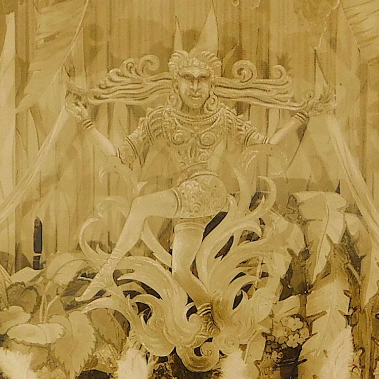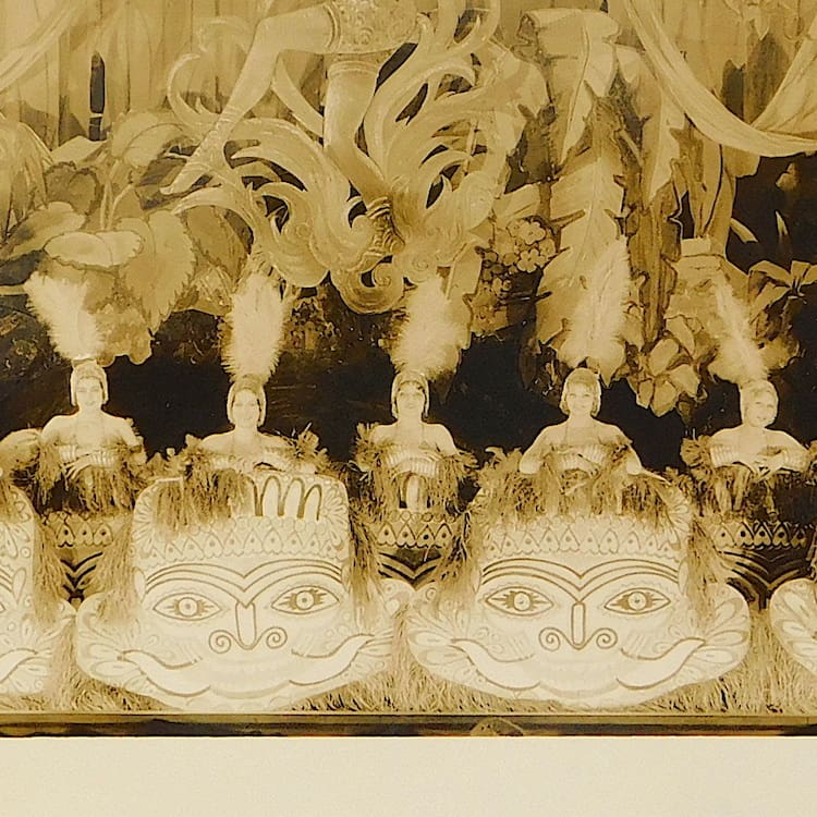 An original photograph of a theatrical performance during 1932. I have been lucky enough to have found a collection of old original French art deco theatrical photos dating to the 1920s – 1930s. This photo is Bali themed with ladies in costume behind Bali God masks. The back is stamped Photo by Lewis F. Nathan Paramount Public Corp.