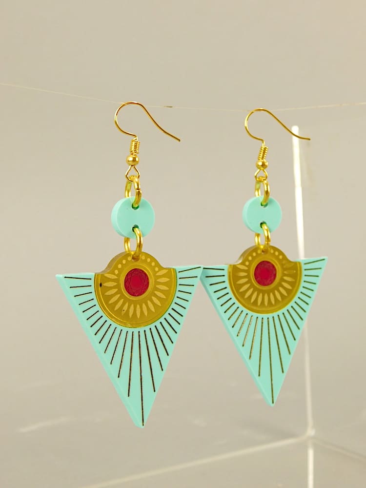 Large hand made acrylic art deco Osiris sun earrings in gold blue. Made for pierced ears.