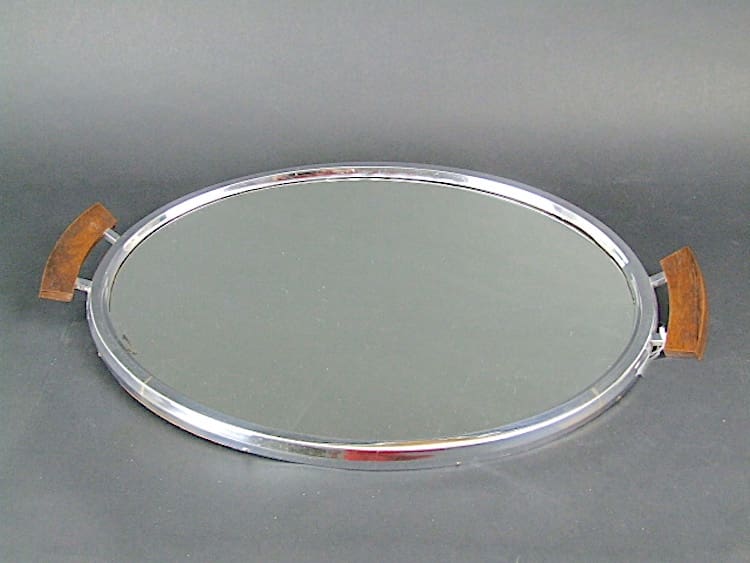 French modernist tray with chrome surround, mirror base and wood handles.