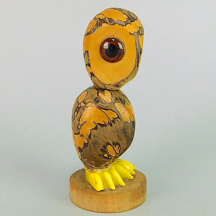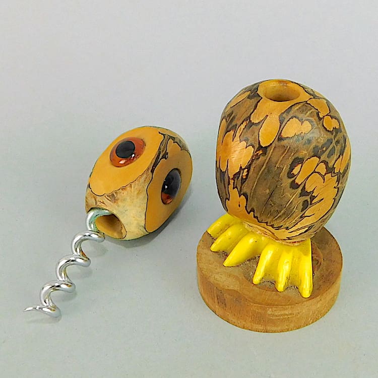 Fabulous owl nutbird, pull off his head and there is a corkscrew to the underside of it. He has yellow phenolic feet and glass eyes.