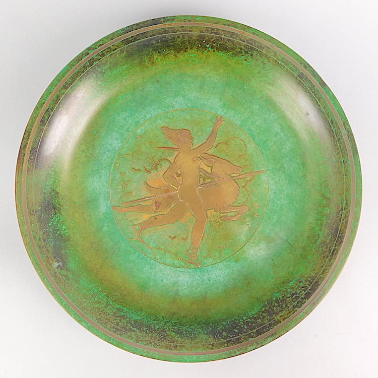 Stunning pair of verdigris patinated, Danish bronze shallow bowls. One bears the bronze silhouette of Diane the Huntress with stag and the other with a pair of leaping deer, with vivid green backgrounds. Both marked to the rear ILFAST HF Bronce. Would look wonderful wall-hung.
