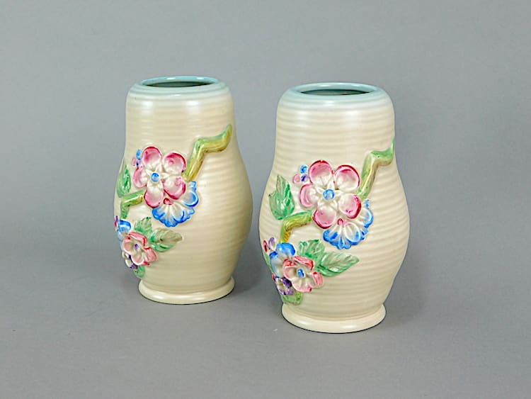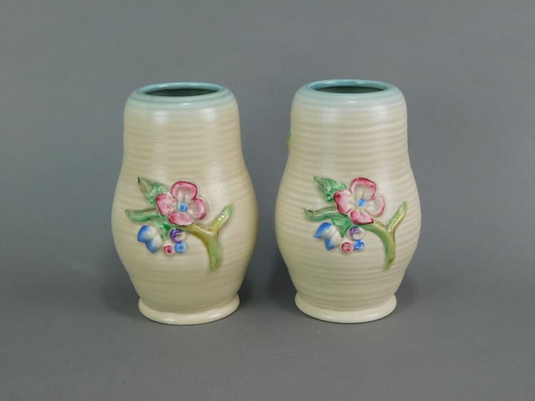 Two Newport Potteries mushroom glaze vases by Clarice Cliff, each signed to the base.