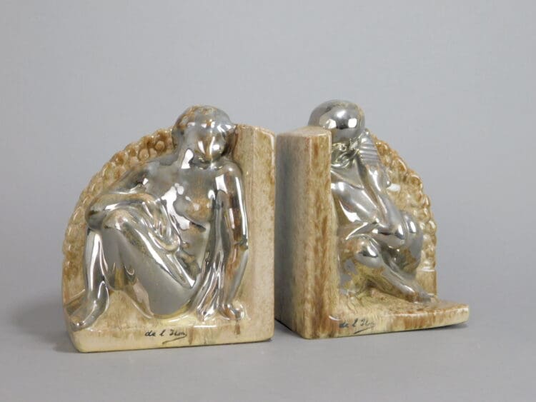 A signed pair of stylised, drip-glaze, mottled cream, brown and chromed bookends as a nymph and pan, and signed De La Hon.