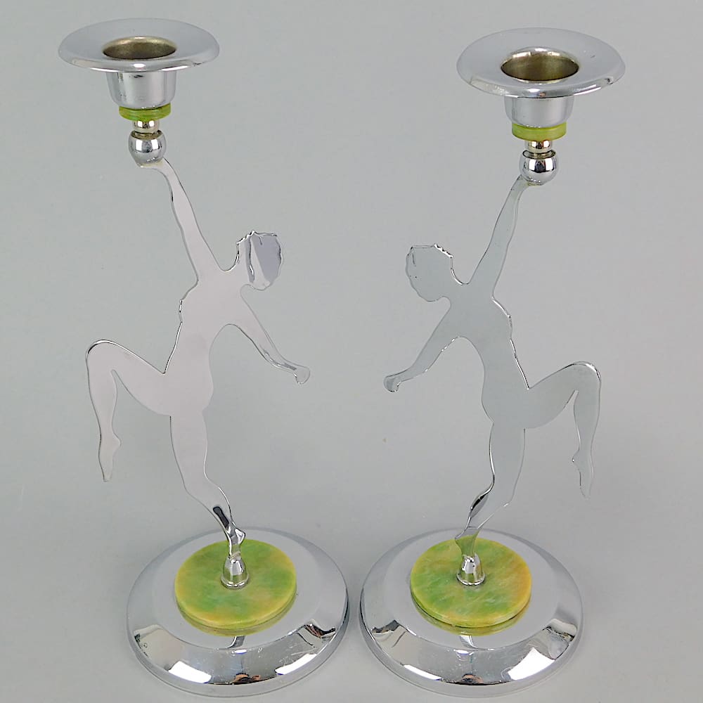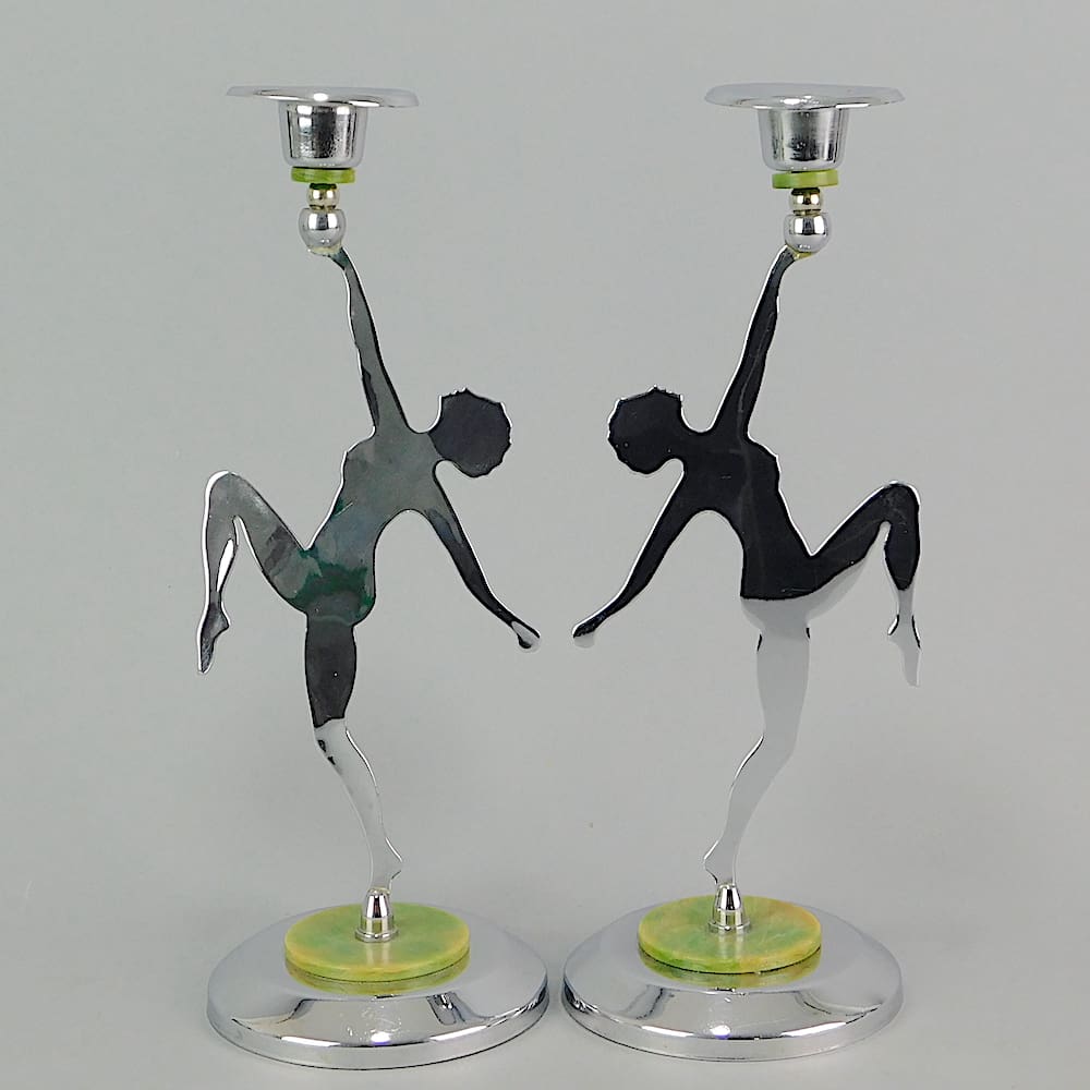 English chrome and phenolic pair of lady silhouette candle stick holders.