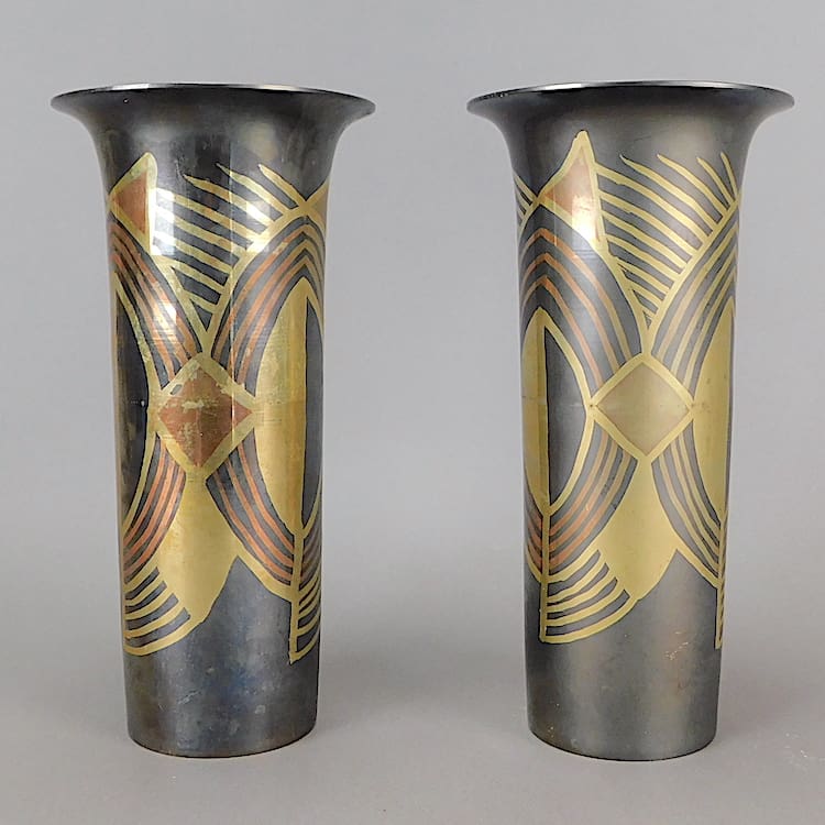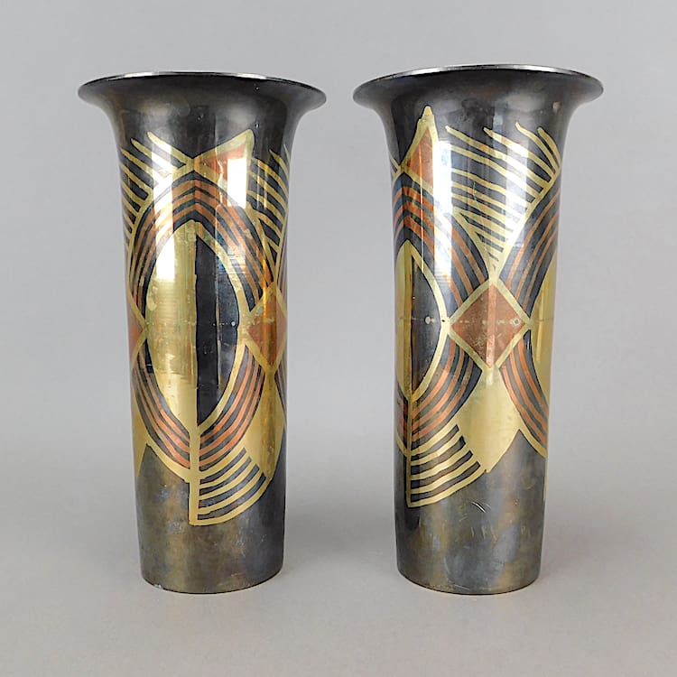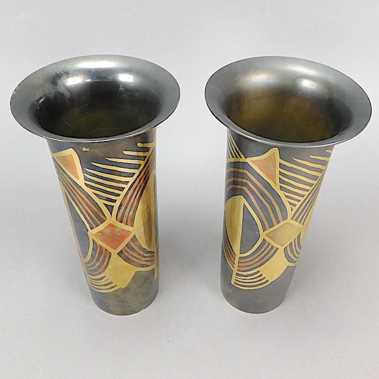 A pair of stunning French art deco metal geometric Dinanderie Vases.