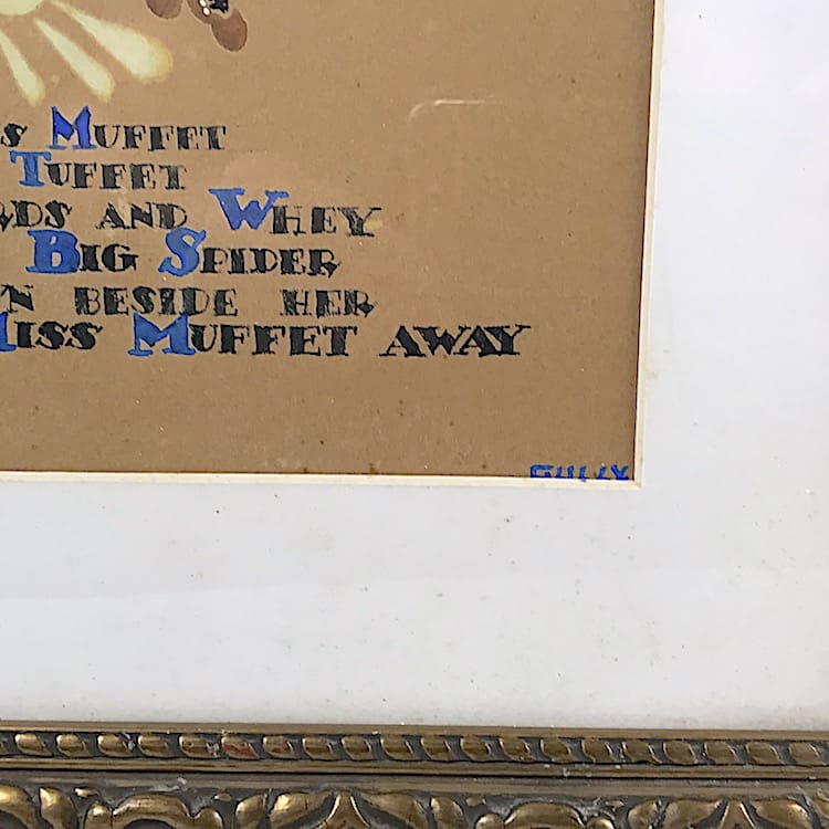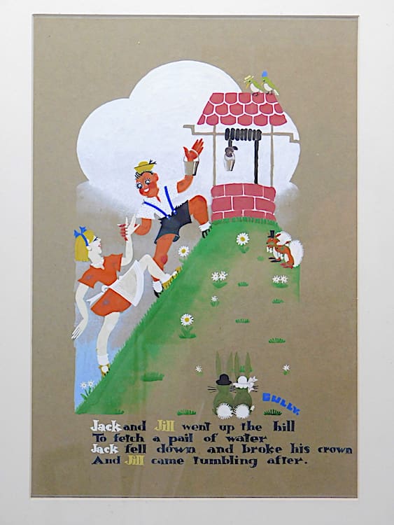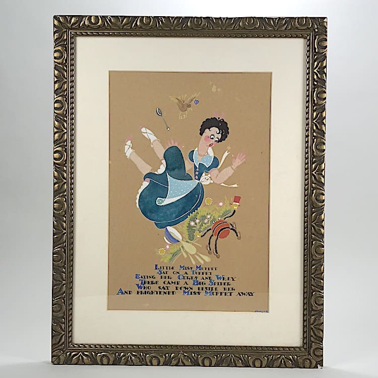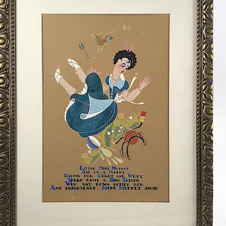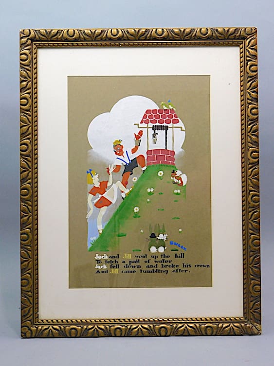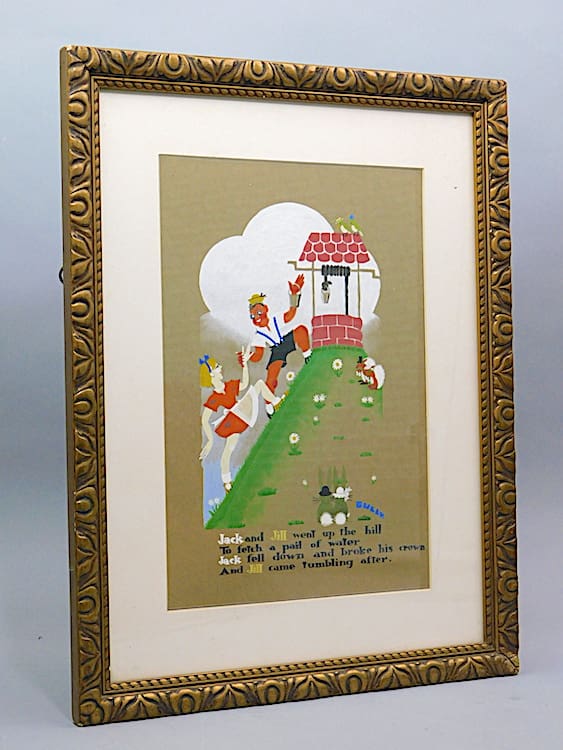 Lovely and very stylish pair of 1920s water colour paintings, both signed by the artist Gully and beautifully hand painted. Possibly made for a childs nursery – the first is of Jack & Jill and the second is Little Miss Muffit and both mounted in their original old gilt wood frames.