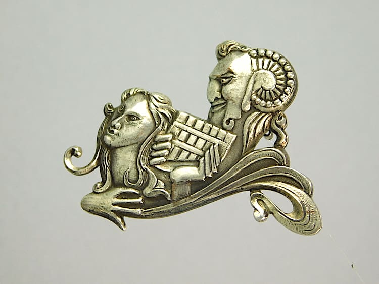A silvered metal brooch with the image of Pan and a maiden. Safety clasp to rear.