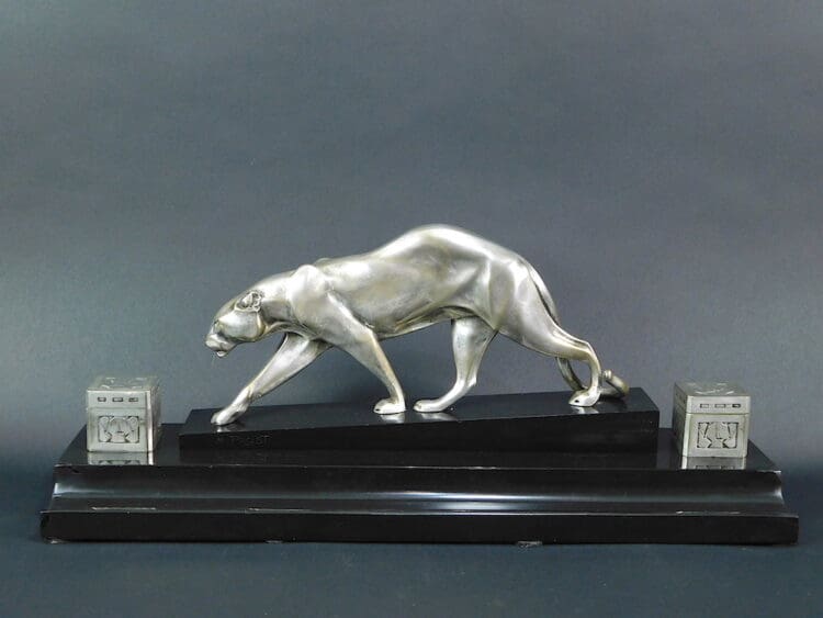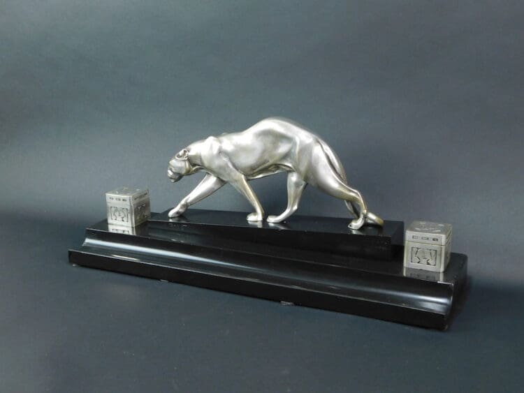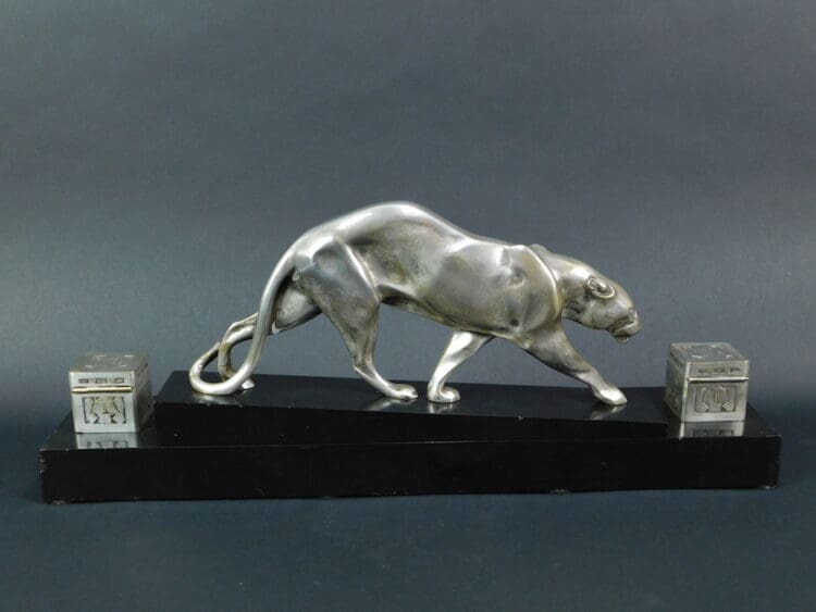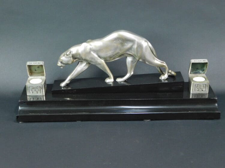 An art deco desk ornament inkwell set with central silvered bronze panther signed M. Prost (Maurice Prost 1894 – 1967) to the marble and with the Susse Fres editors Paris mark. Also signed Delannoy to the silvered bronze ink wells and Susse Fres editors Paris.